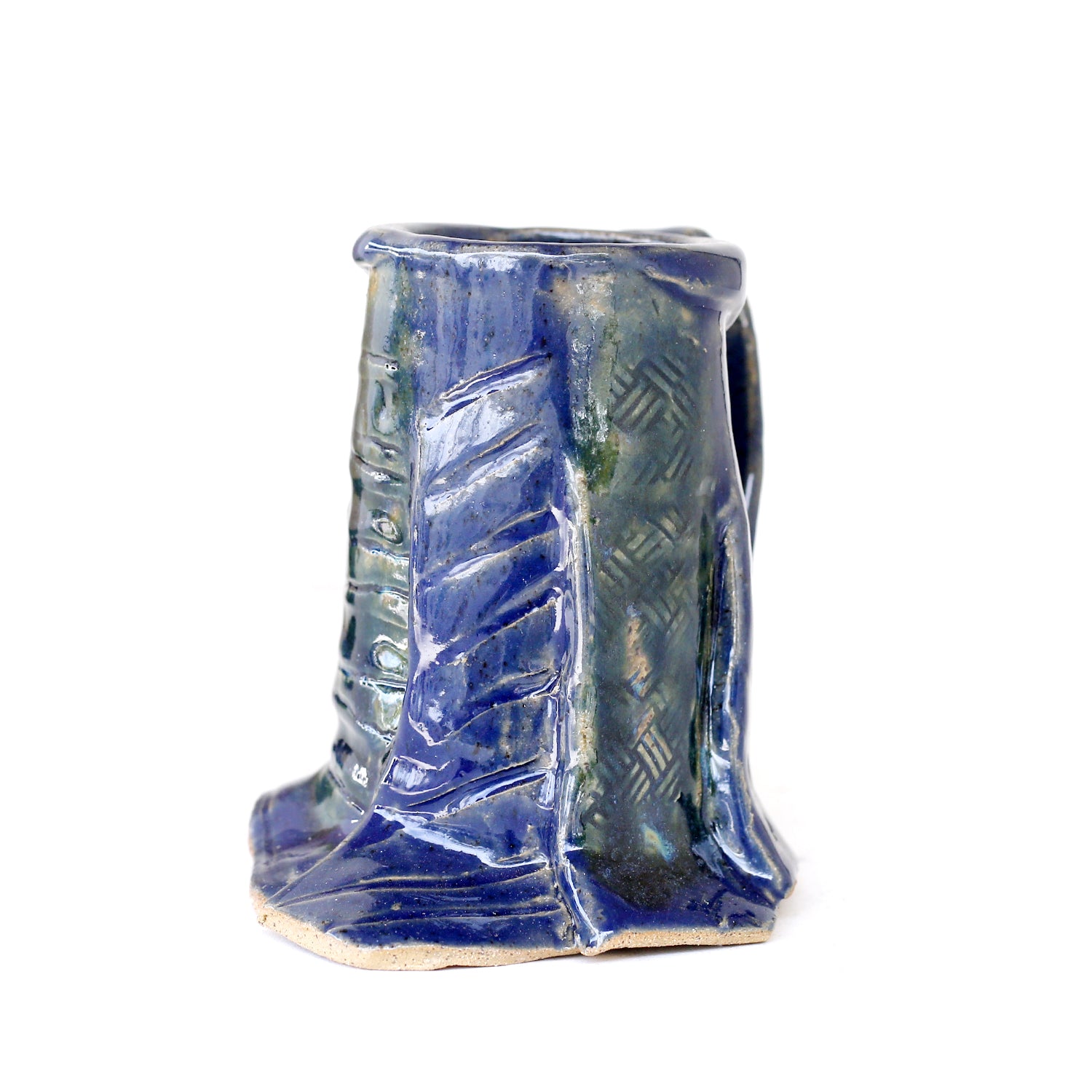 hand built sculptural ceramic mug made out of many "neck ties" including the design of the handle, blue glaze