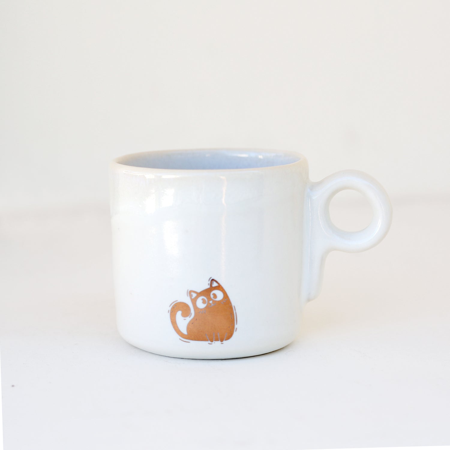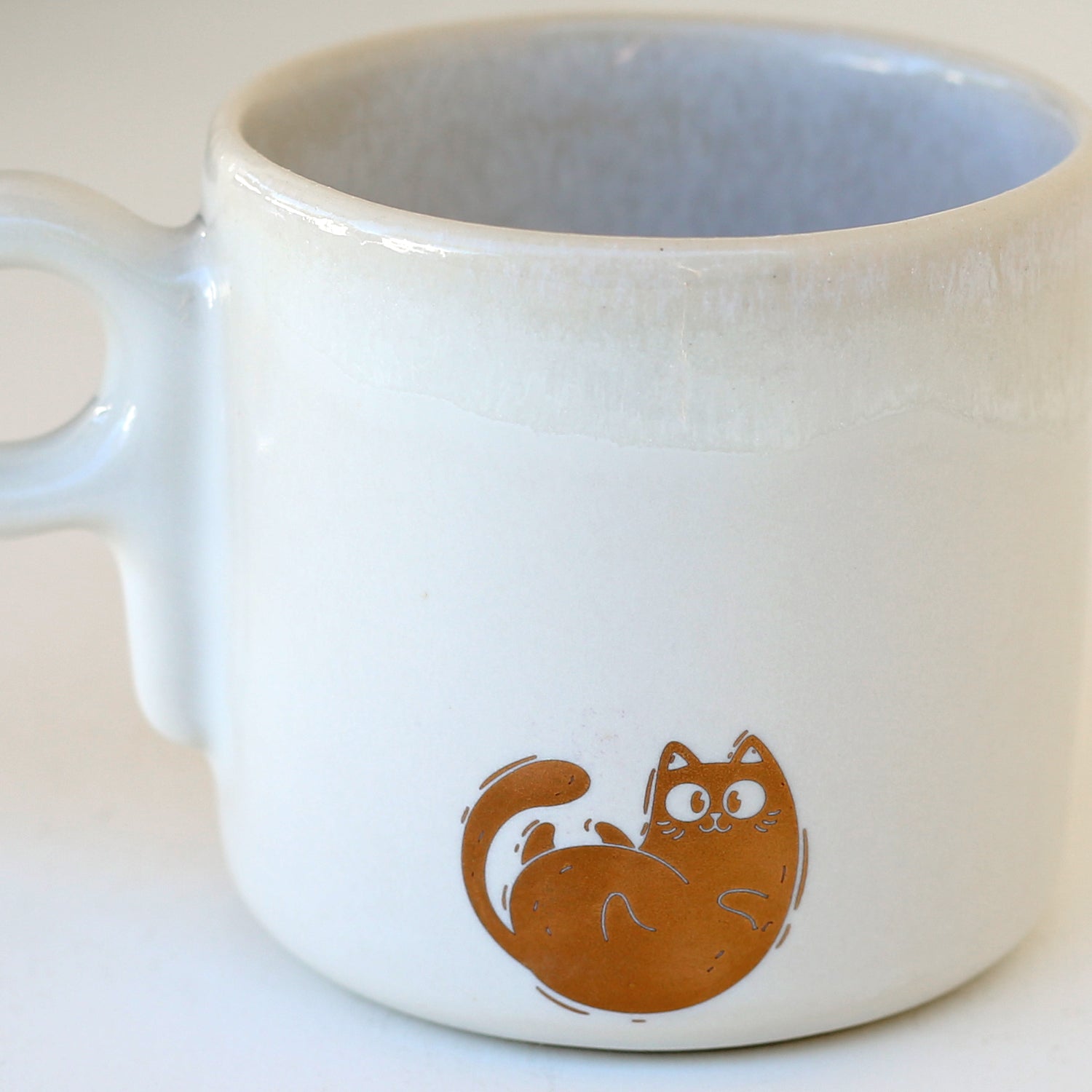Porcelain mug, slipcast, white glazes, cone 6, gold cat decals