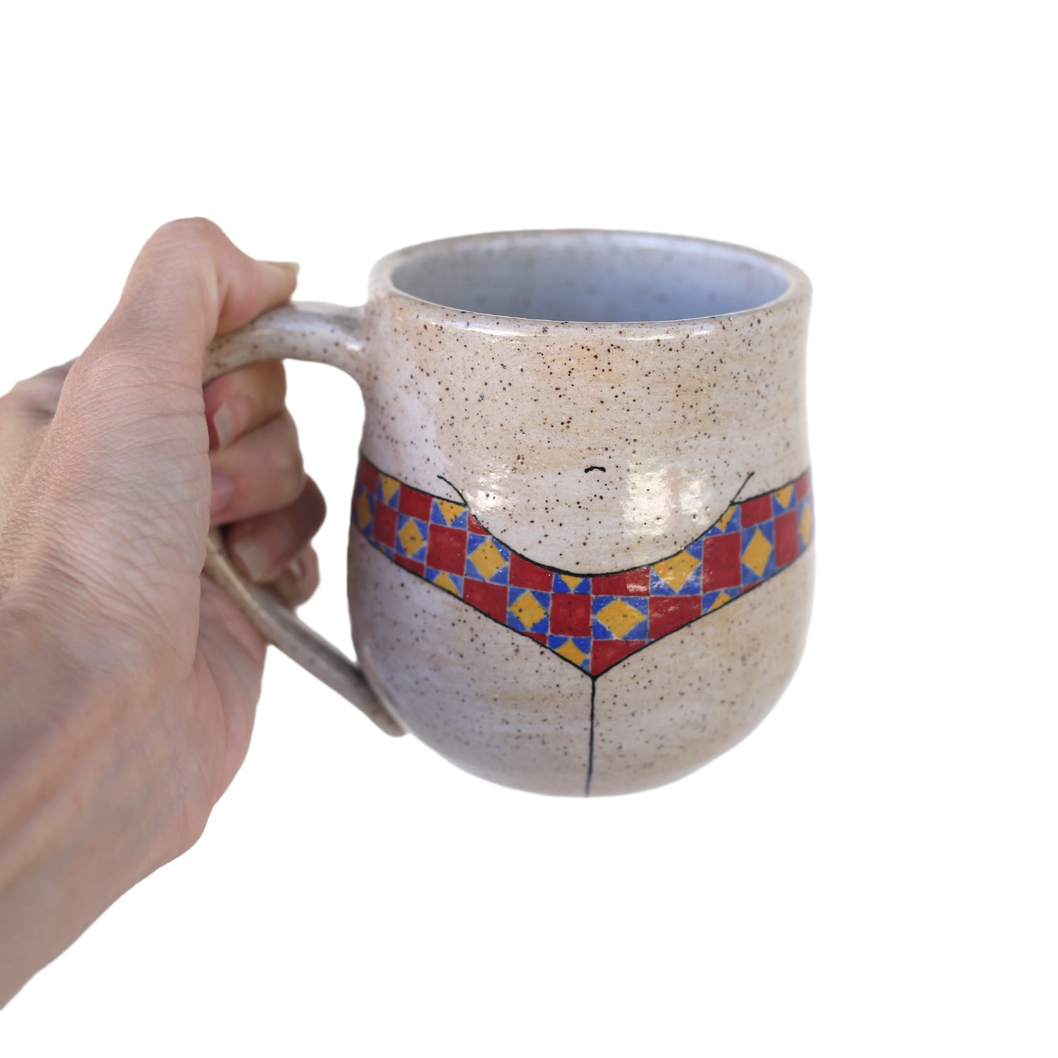 ceramic mug, hand painted with a human form: red and blue with yellow diamonds checkered swimsuit/underwear bottoms