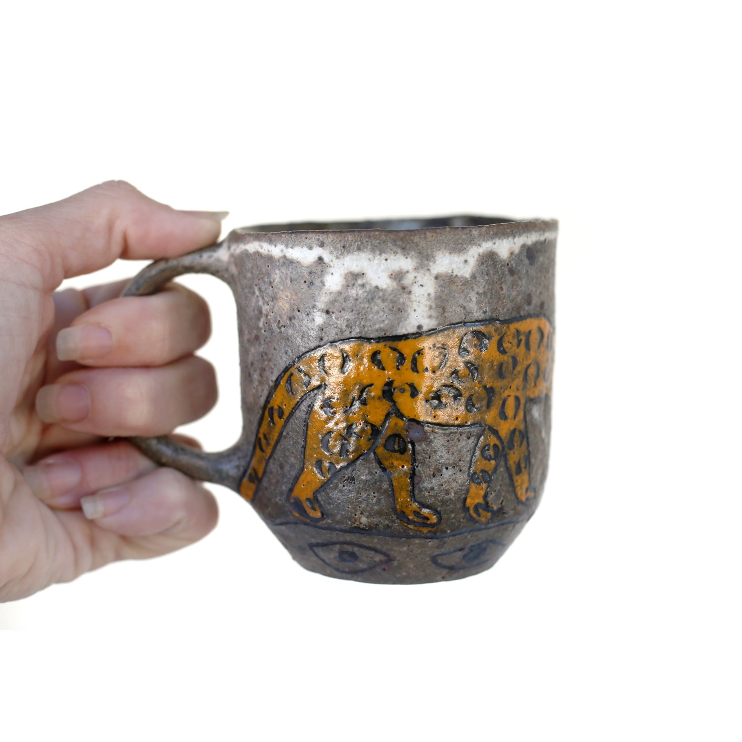 hand-built mug with two cheetahs and eyes painted around the base of the mug