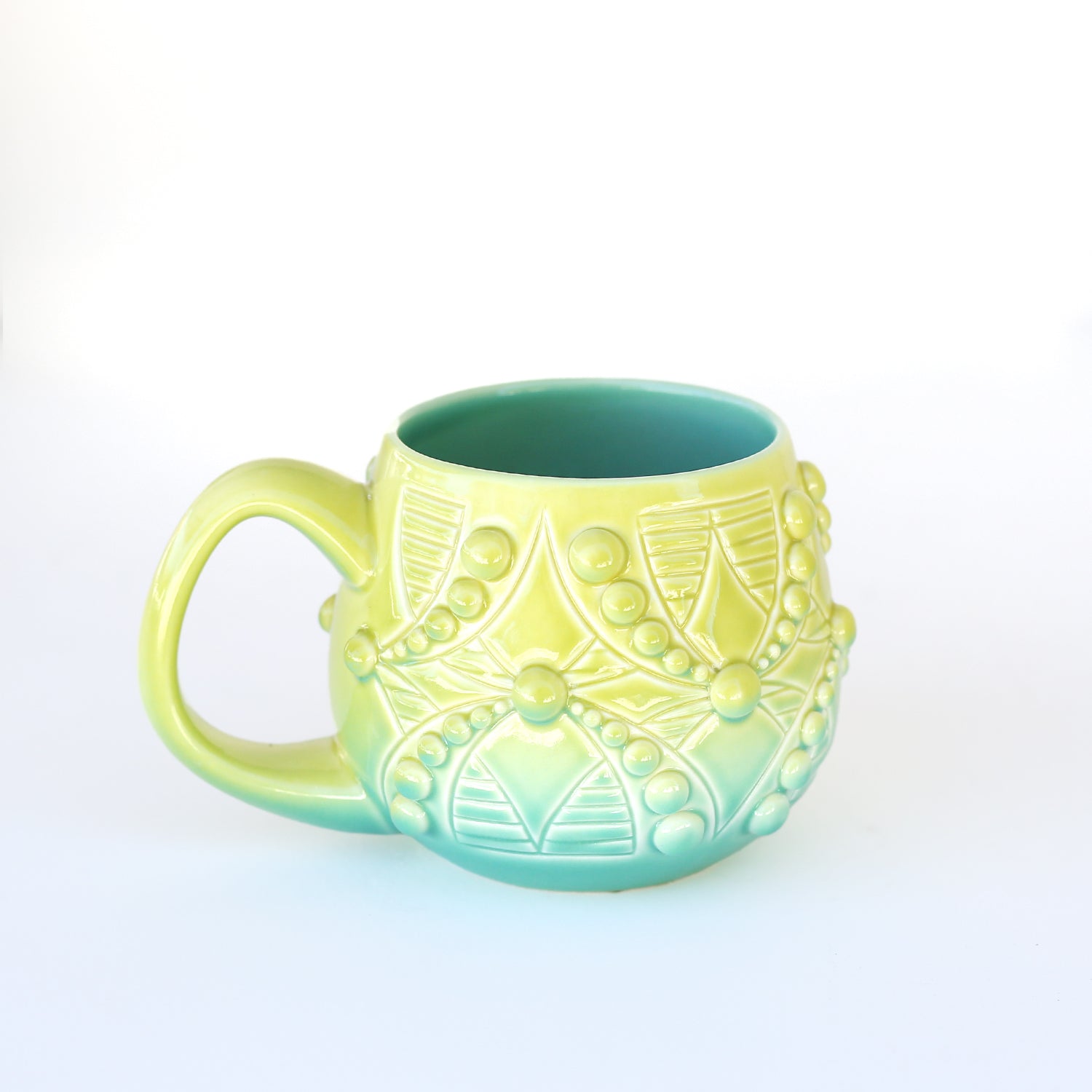 ombre green mug with beautiful geometric glaze design hand painted by artist