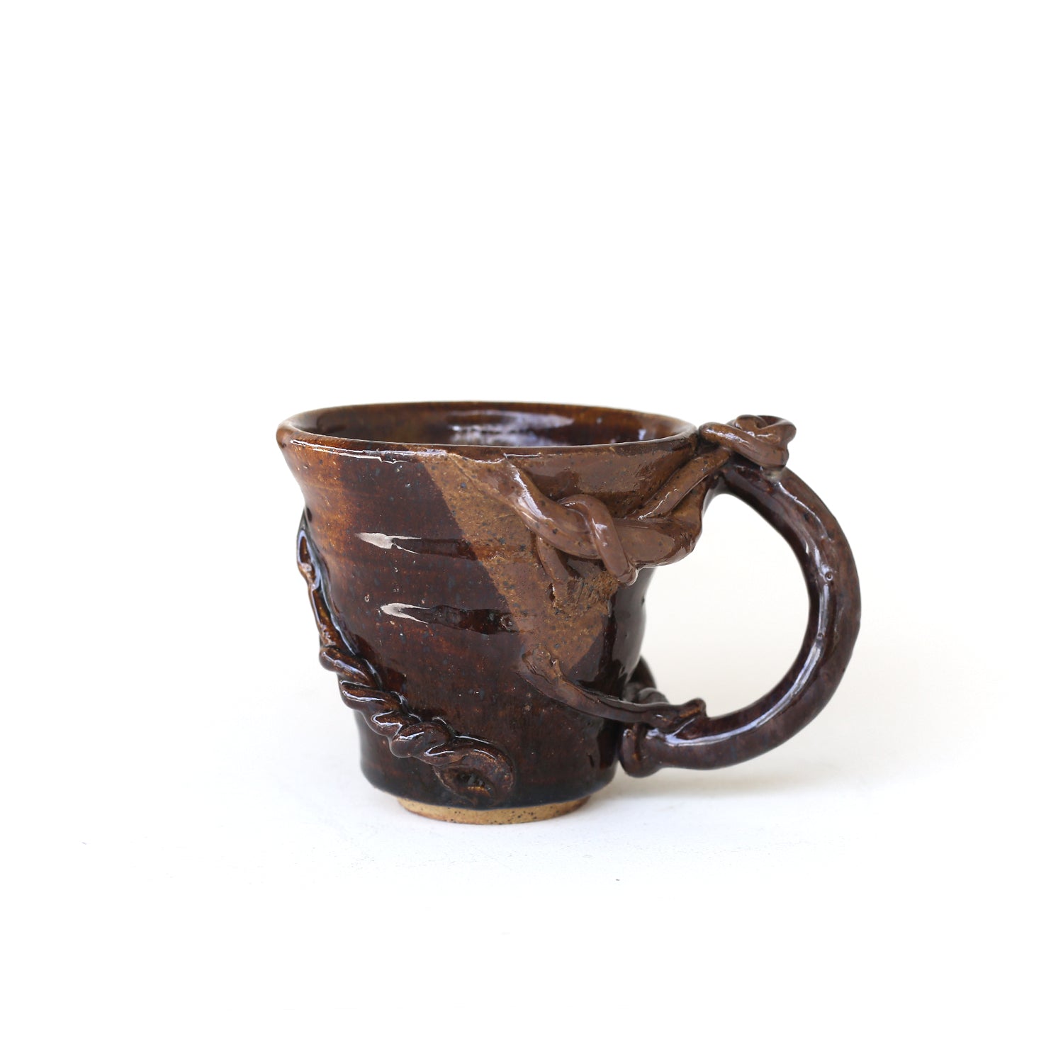 hand built ceramic mug, brown/caramel glaze with vine styled handle