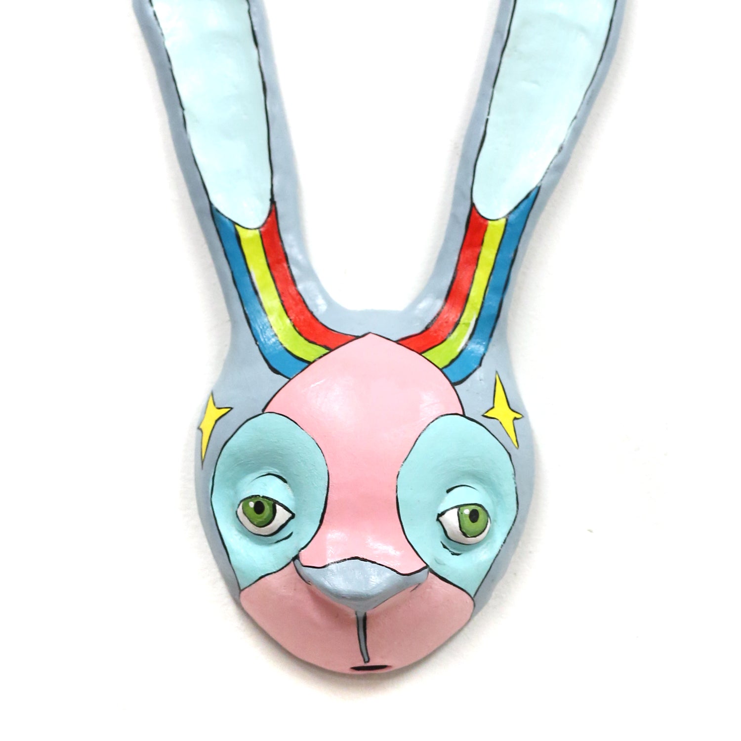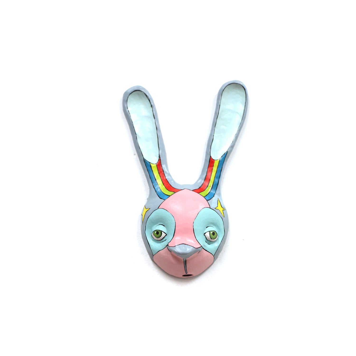 ceramic sculpture of a blue and pink bunny mask