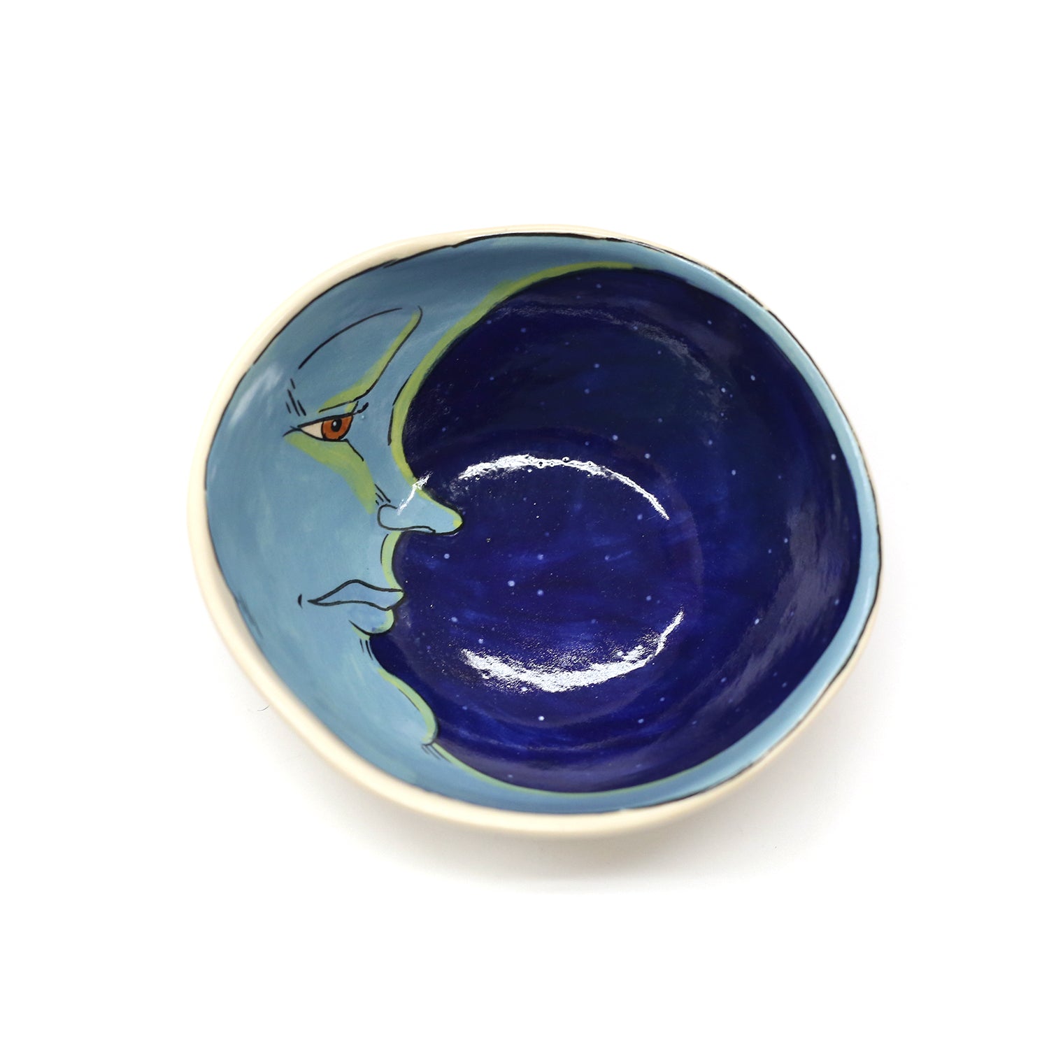 ceramic bowl with dark blue sky and light blue moon on inside.