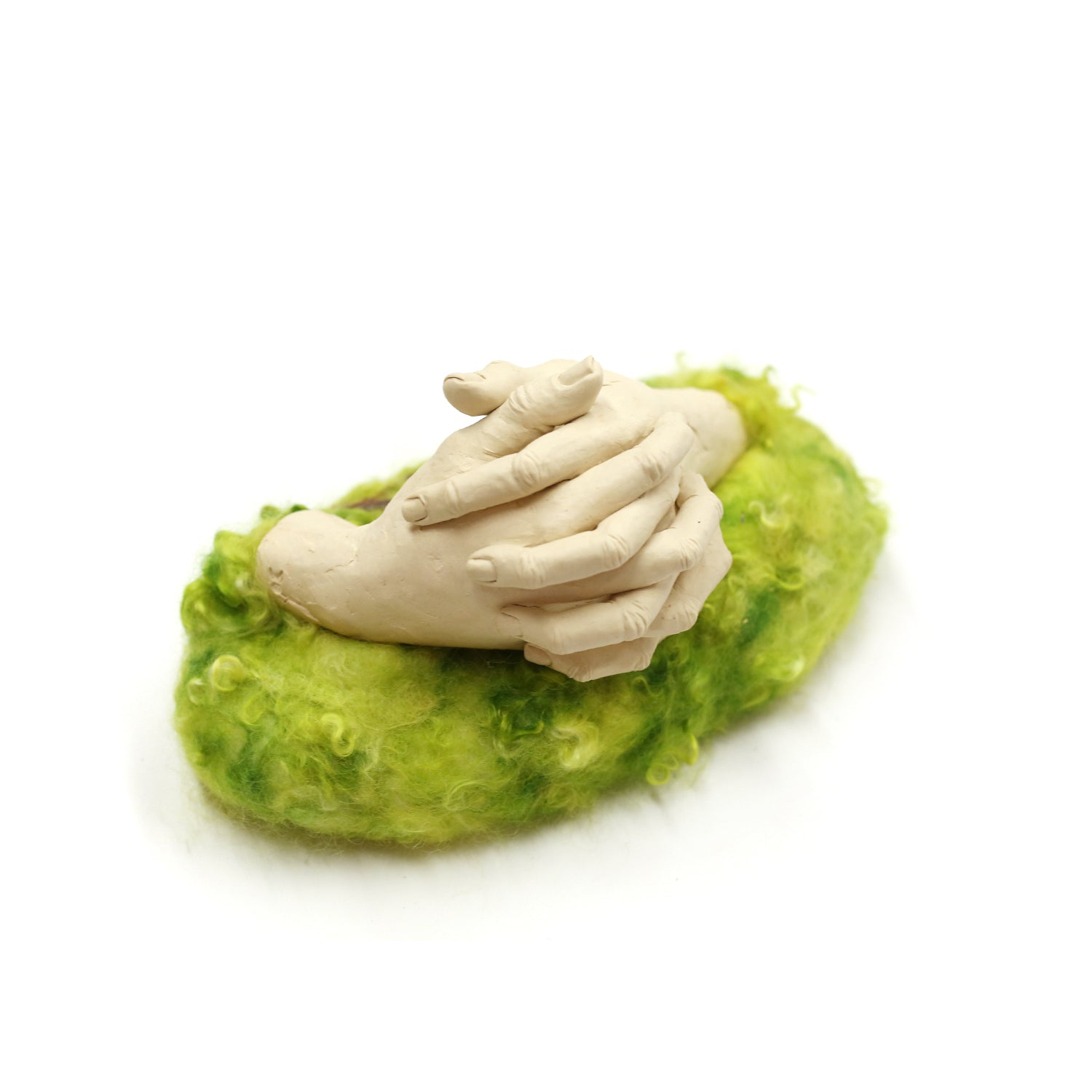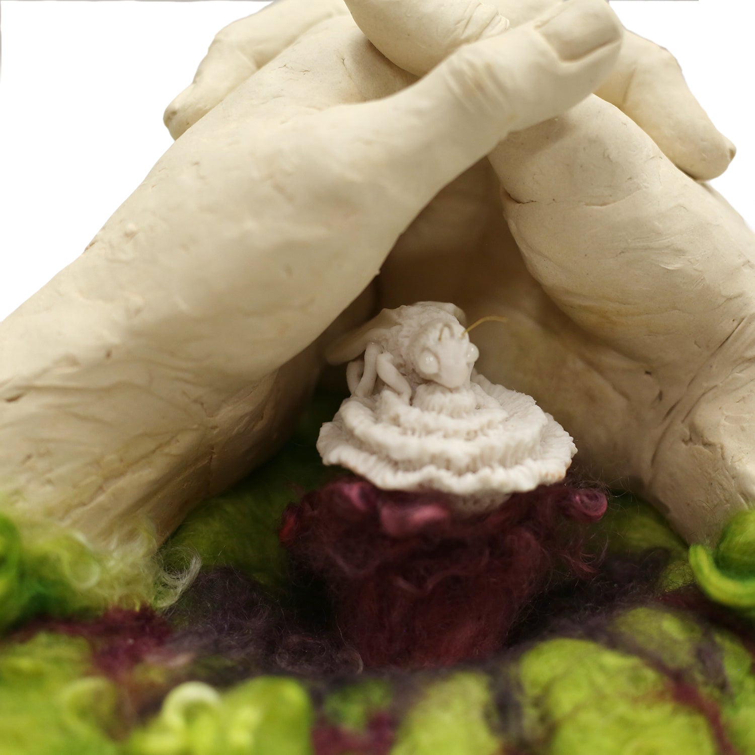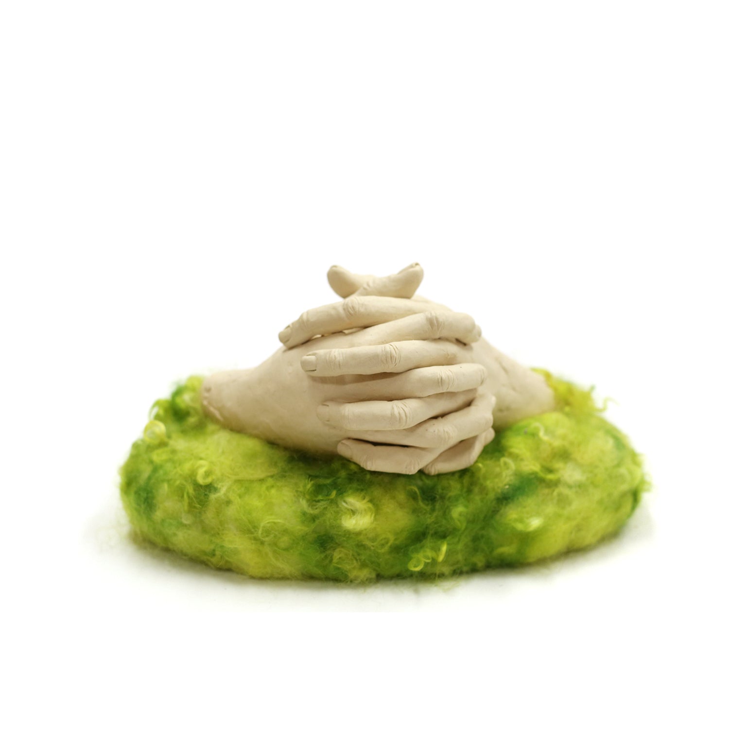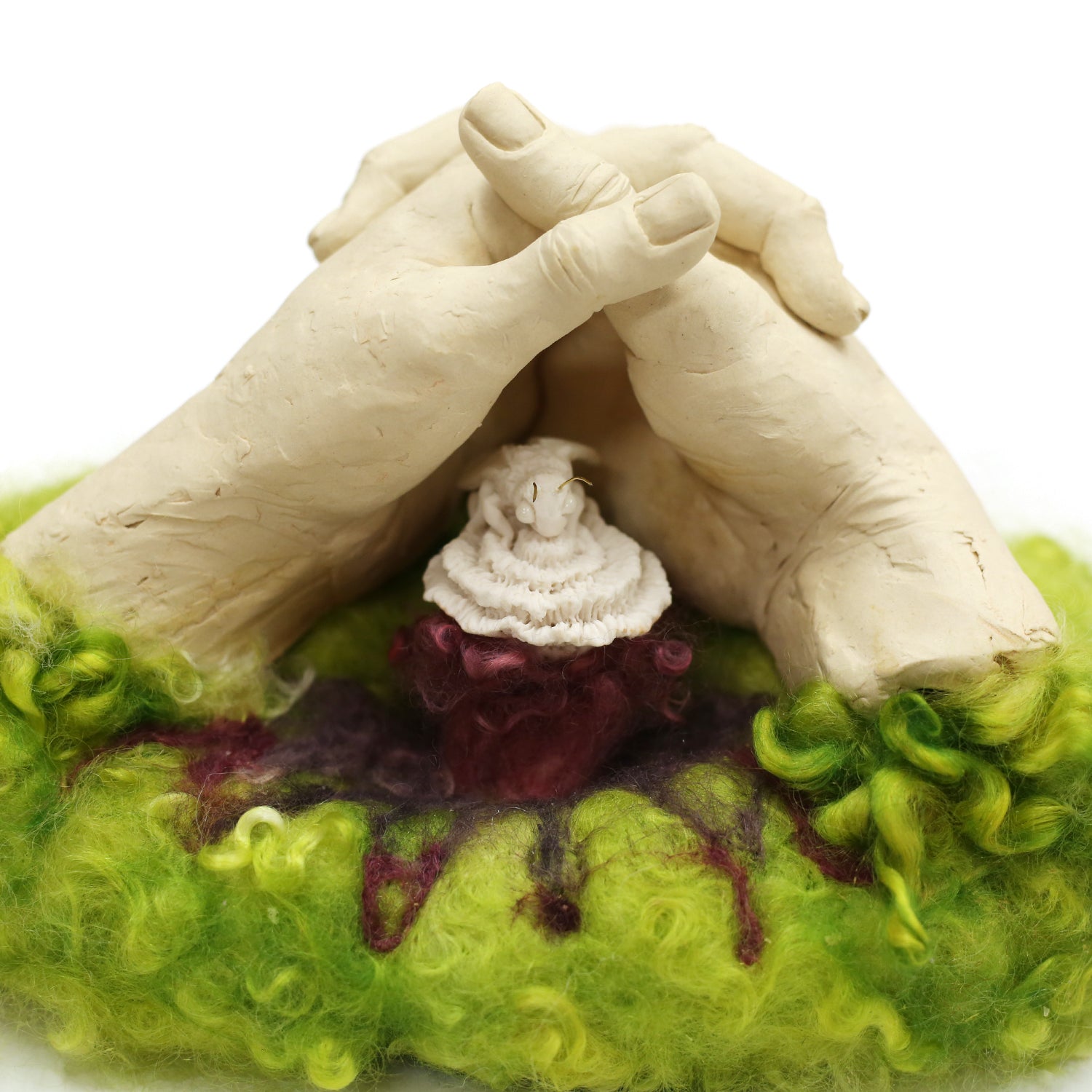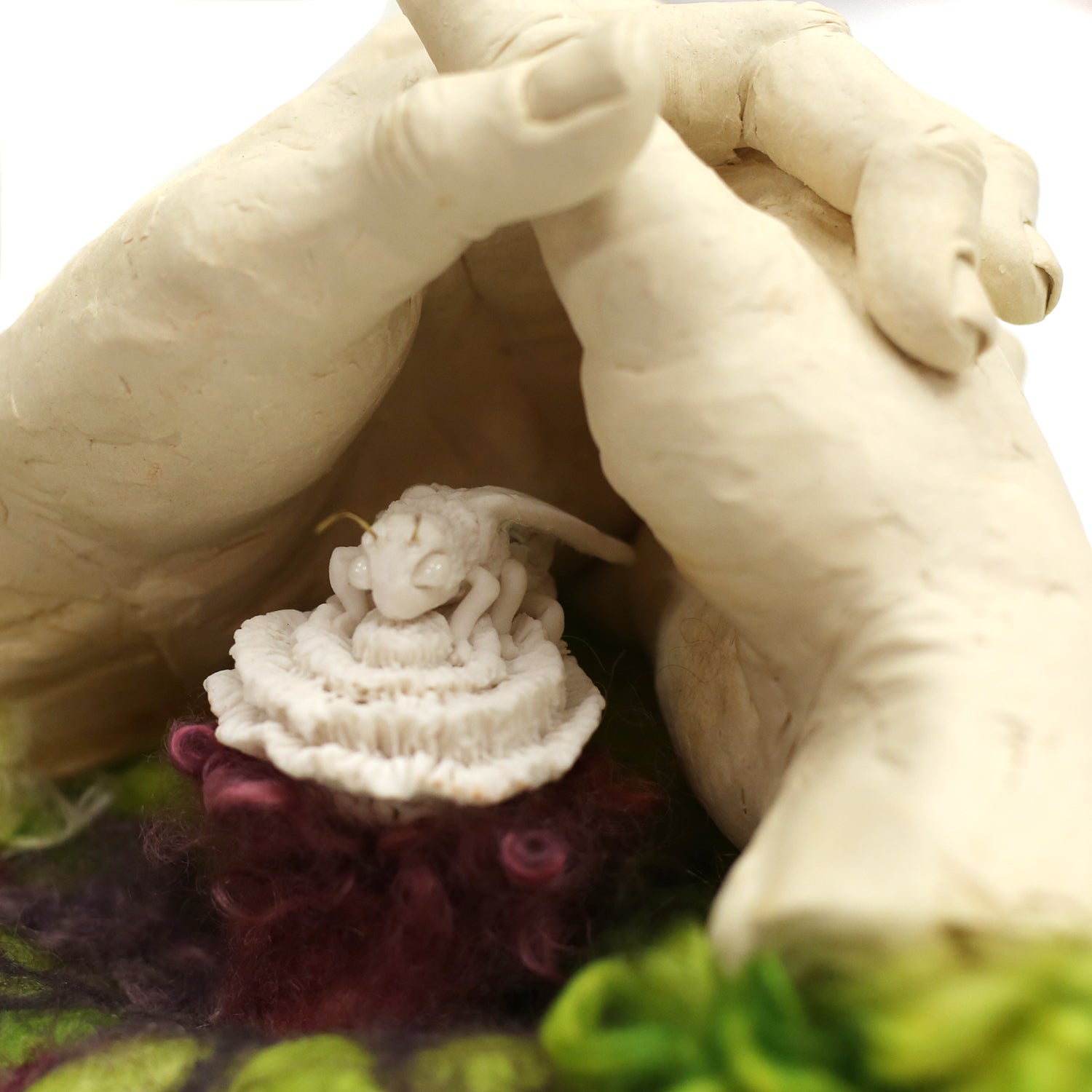 stoneware clay, porcelain, glaze, wire, felted wool