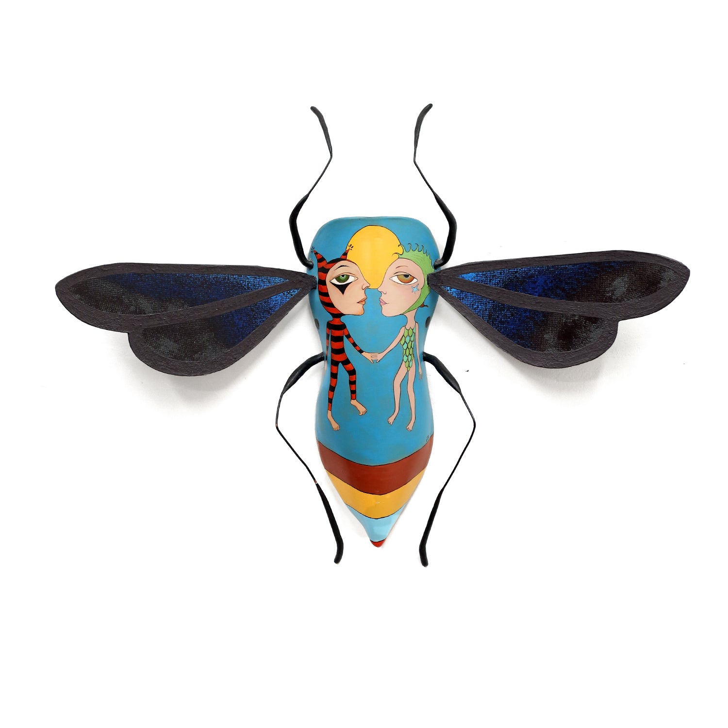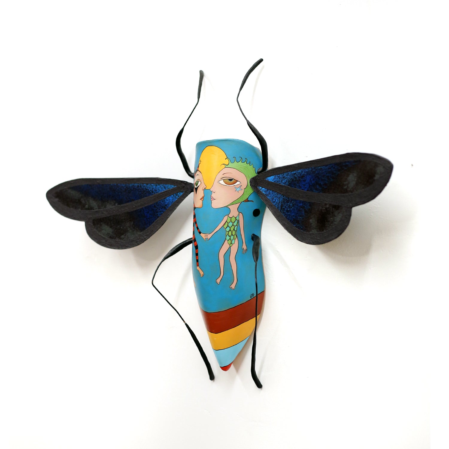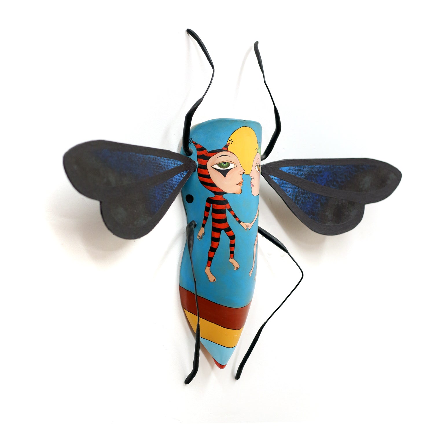 Mixed Media ceramic sculpture of a bug, with a painting of two people holding hands on the body of the bug
