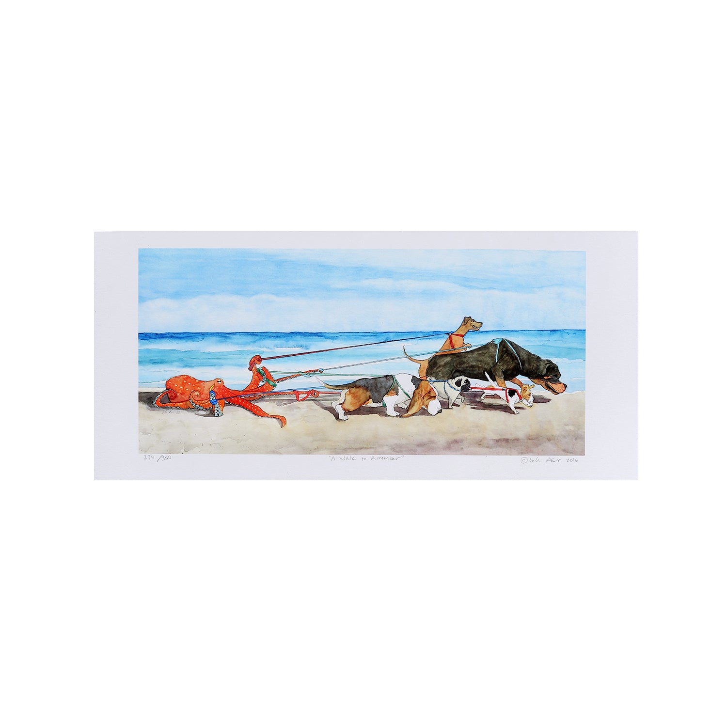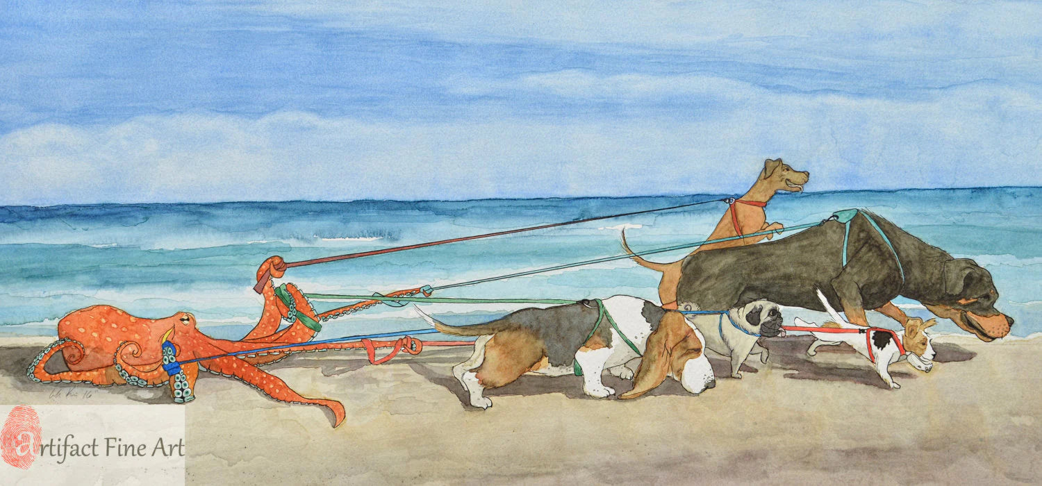 image description: an orange octopus walking five dogs along a beach with blue waves and sky in the background