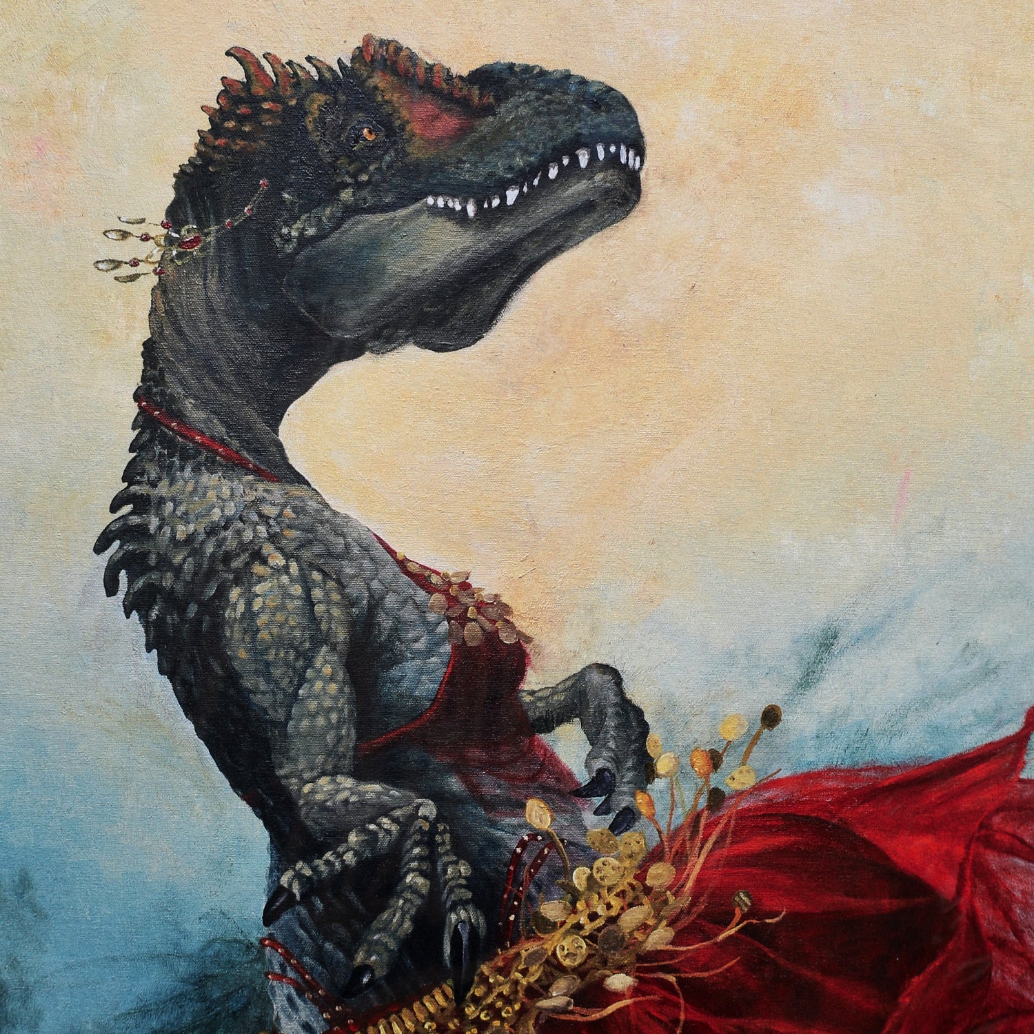 image description: a T-rex Dinasaur dressed in a red and gold belly dancer outfit with an ombre yellow to blue background