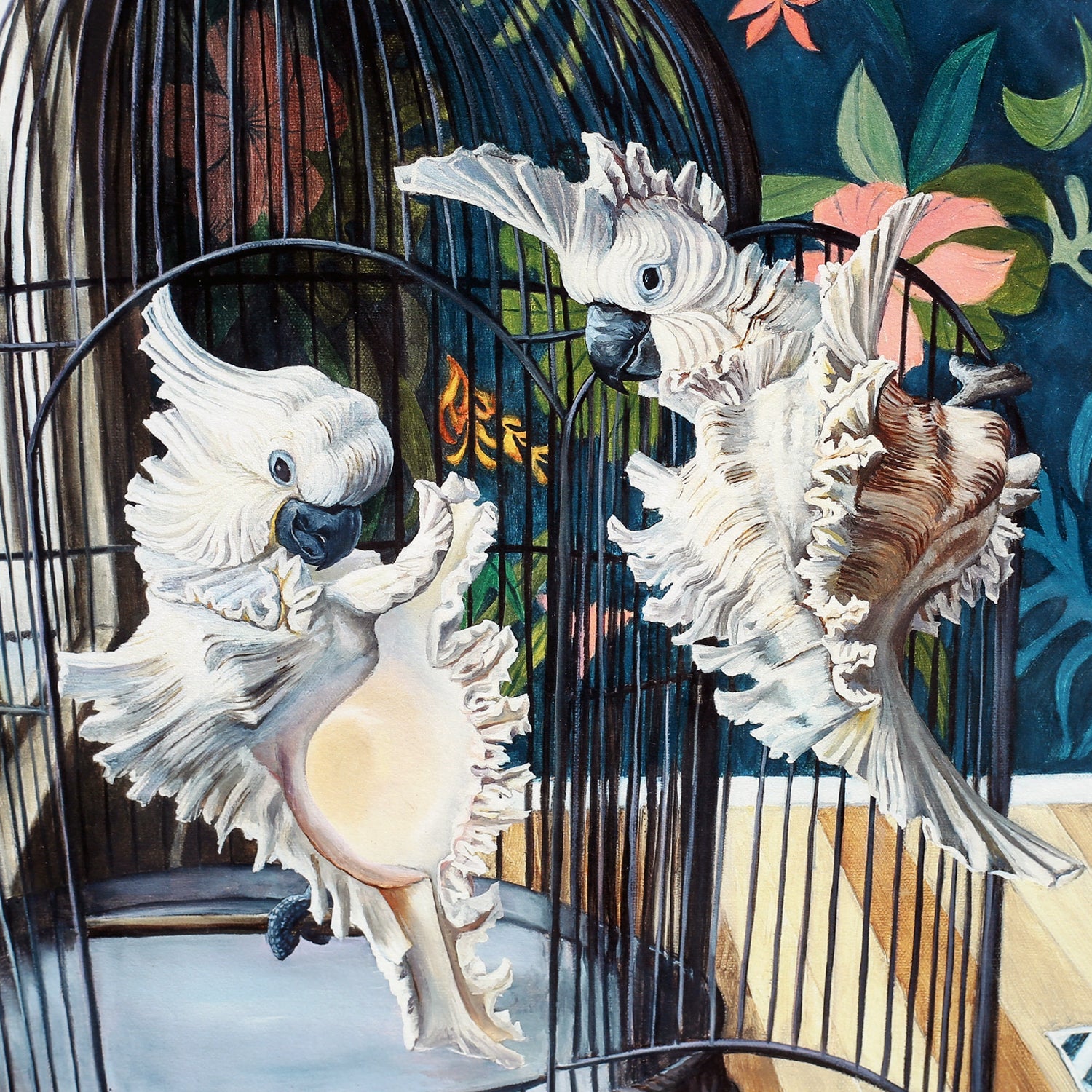 image description: two white cockatoos with feathers textured and painted as shells flying outside of a black cage inside a room with wood flooring and leaf wallpaper