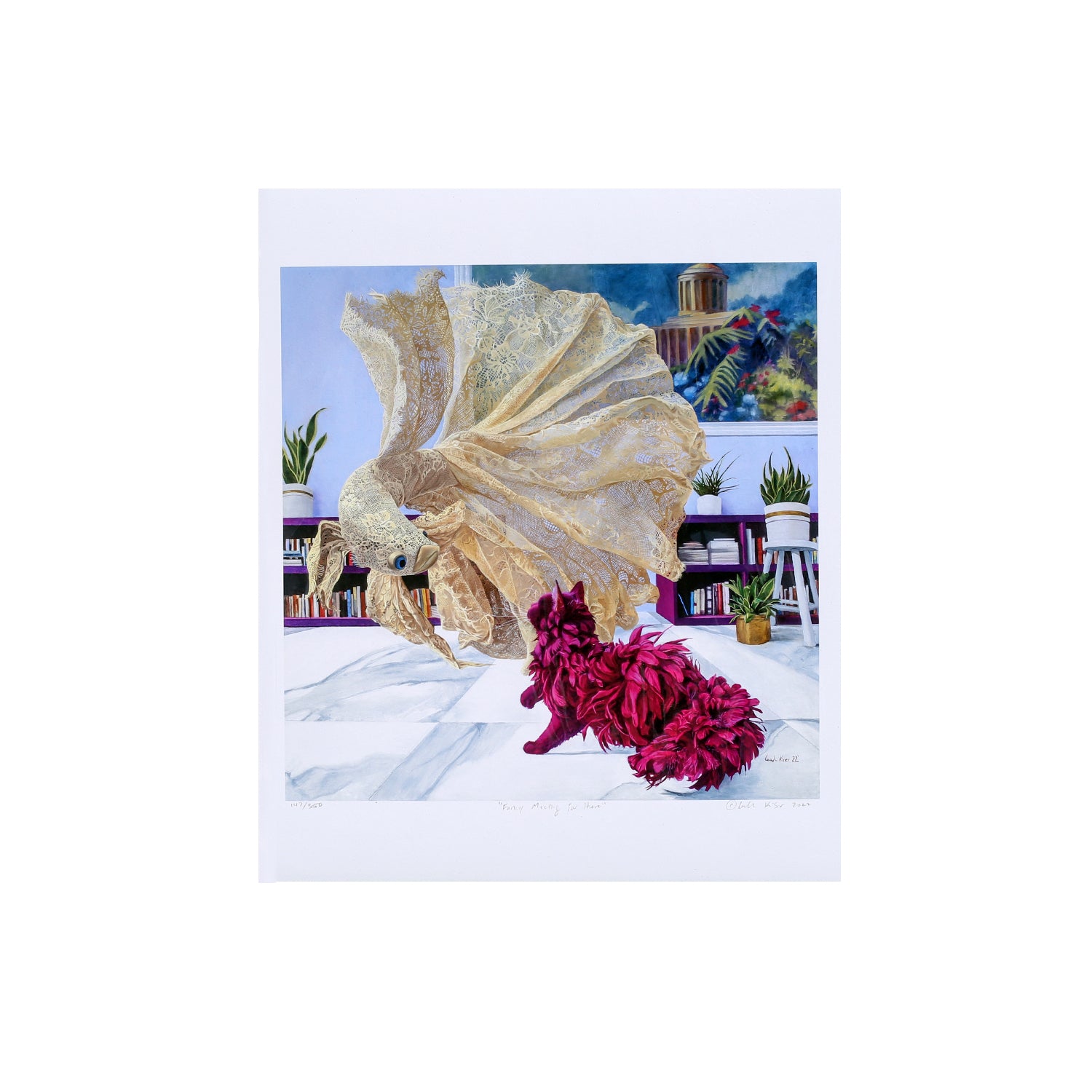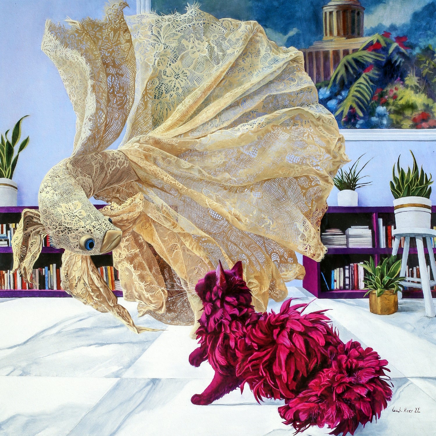 image description: one bright pink feather cat looking up and reaching out to a gold lace fish in a living area that has marble tiles, purple bookshelves and a light purple wall with a large painting in the background