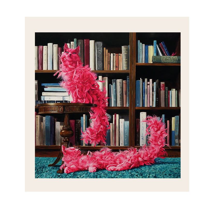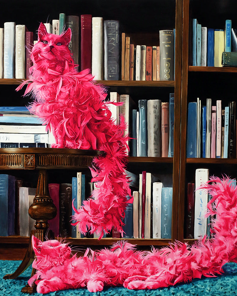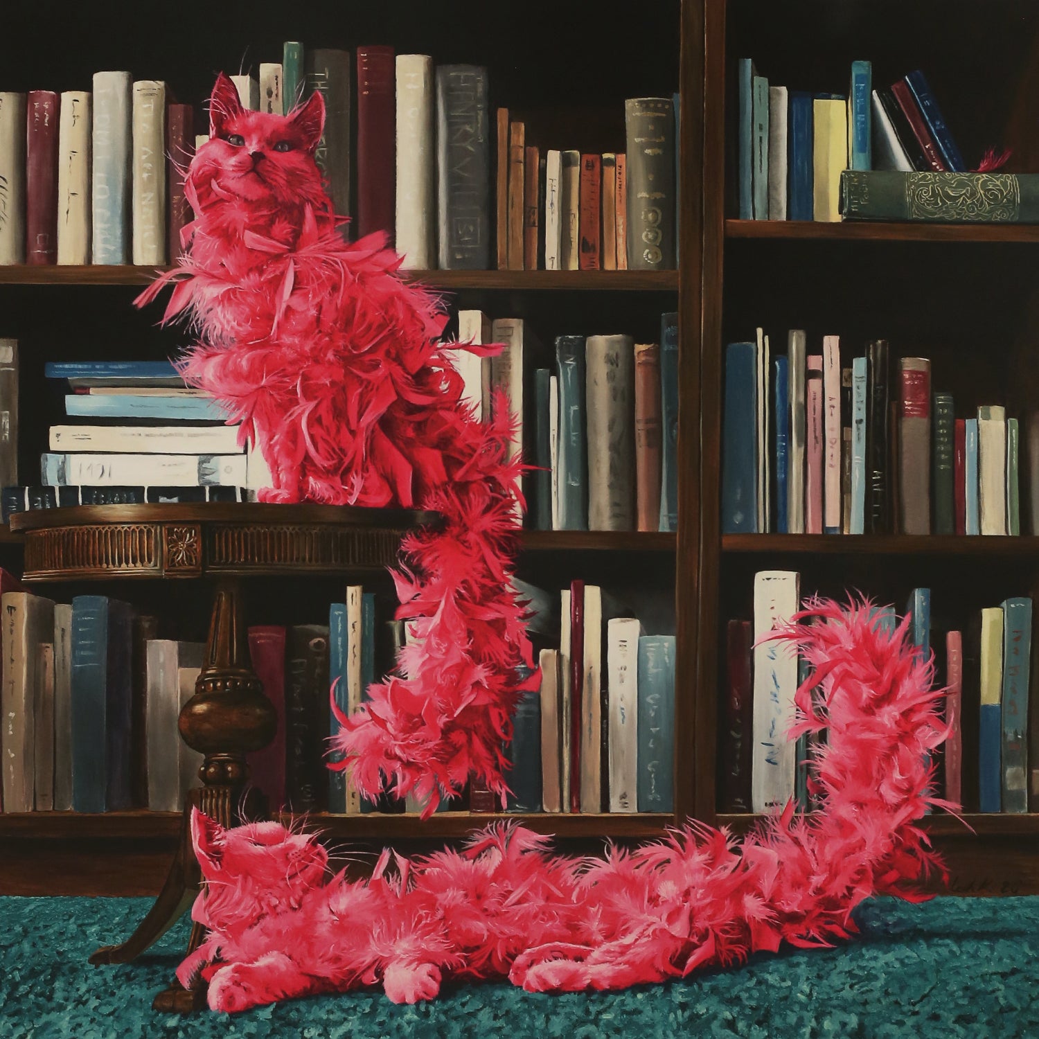 image description: two bright pink feather cats, one laying on a turquoise carpet, the other sitting on a round dark wood table, in front of three shelves of two bookcases full of different color books