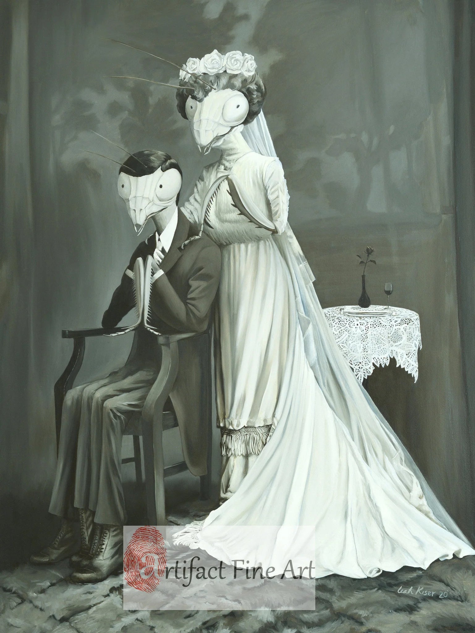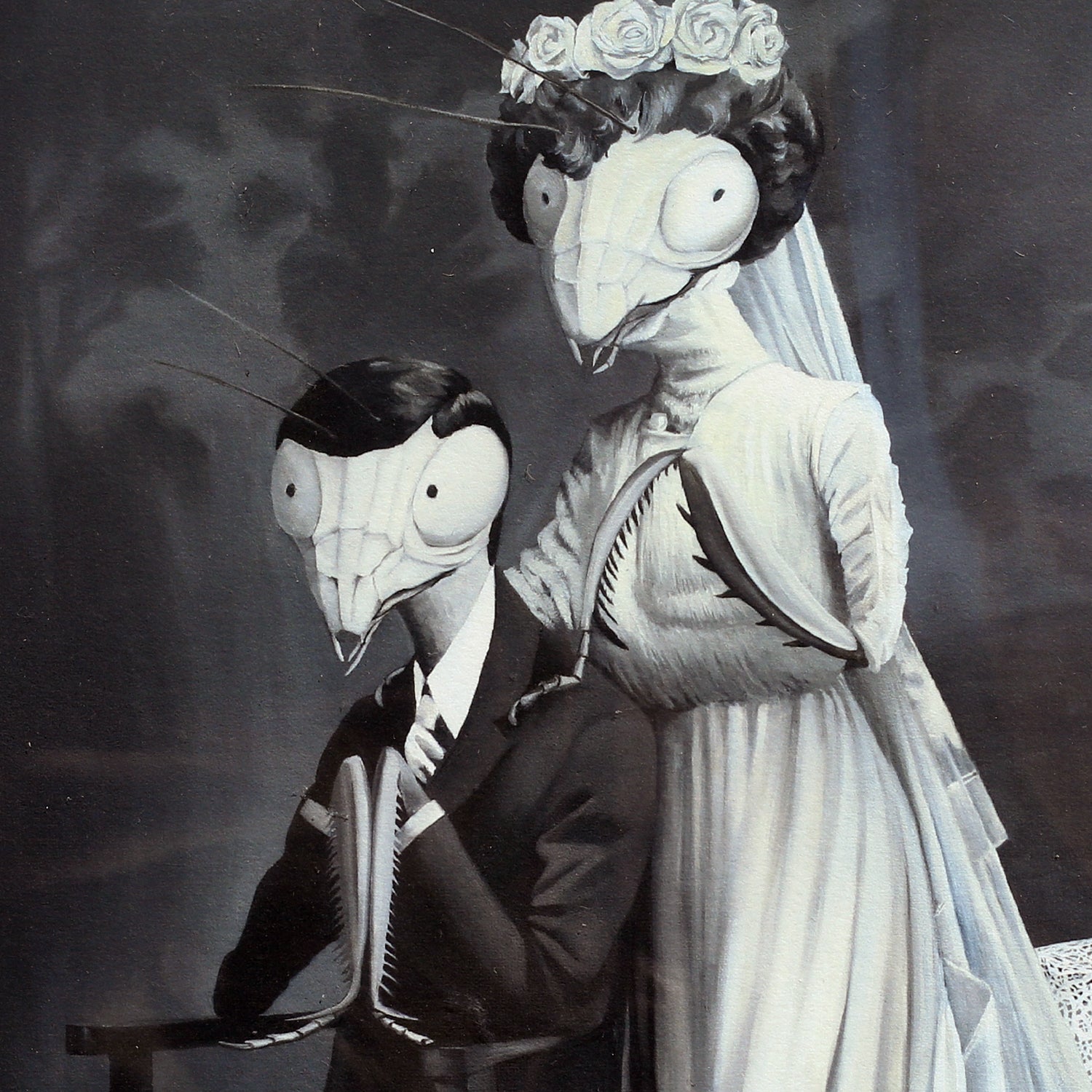 image description: a male and a female praying mantises dressed as a bride and groom, setting up for dinner for the bride of the groom