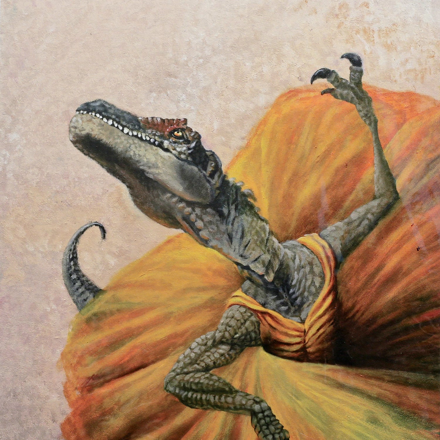 image description: a raptor in a yellow ballerina costume with a tan/grey background