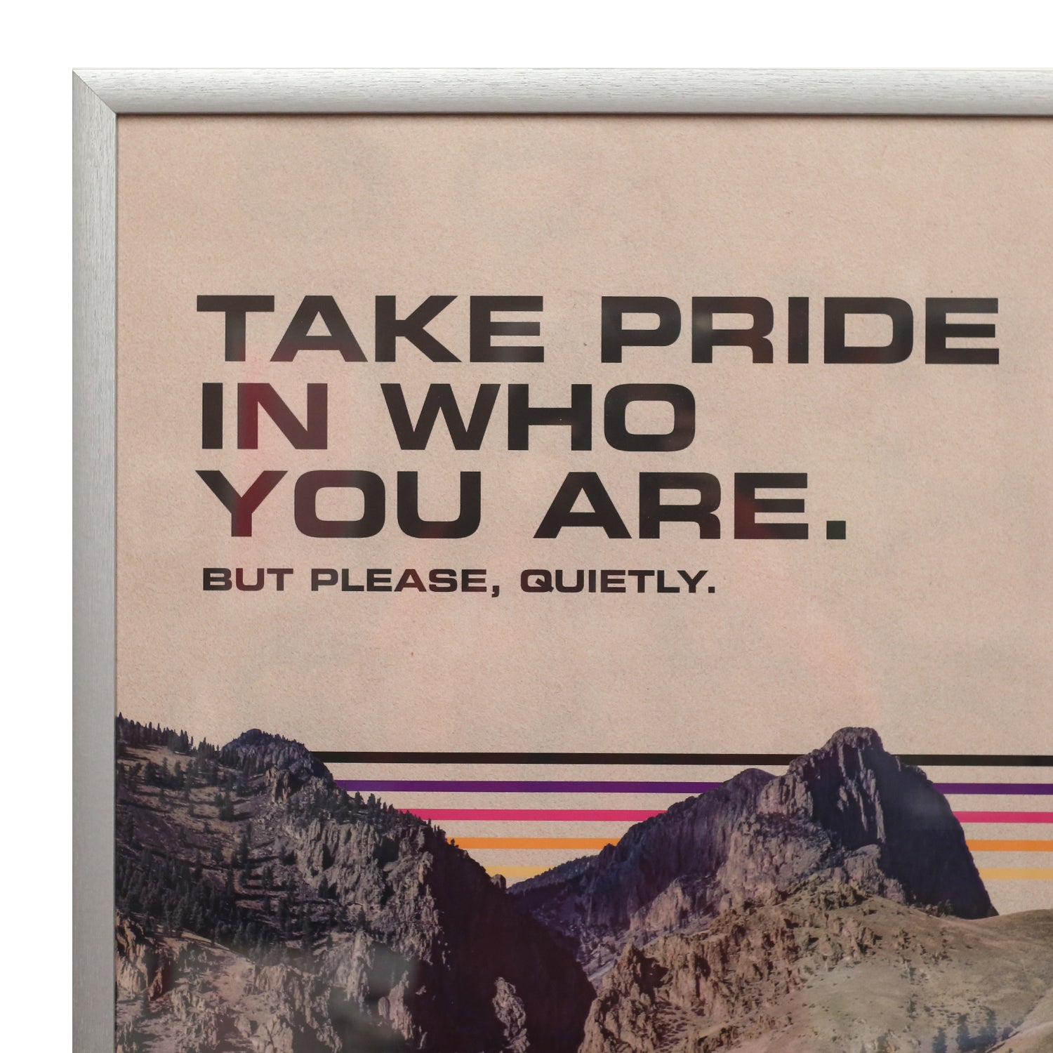 The poster reads "TAKE PRIDE IN WHO YOU ARE. BUT PLEASE, QUIETLY."