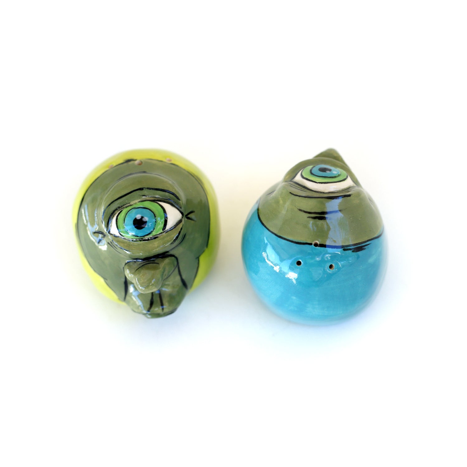 Mixed Media ceramic sculptures function as a salt and pepper shakers.
