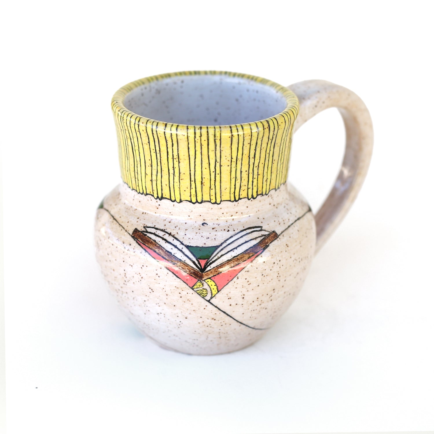 ceramic mug, hand painted with a human form: pink and green swimsuit/underwear bottoms with lemons and a yellow design around the rim of the mug and a book on the front of the mug
