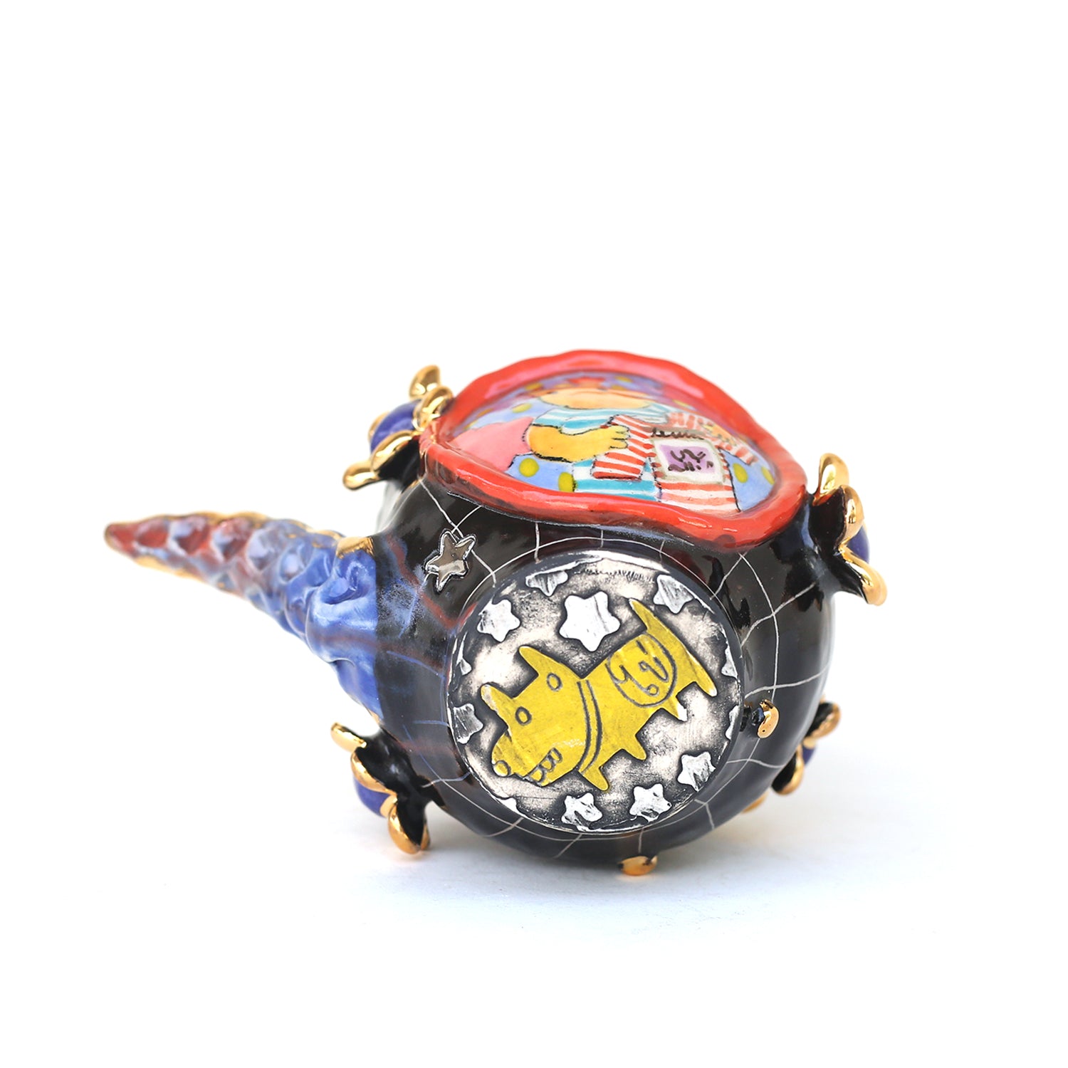 black grid mug with circle “window” of character detail with gold luster glaze detailing and ombre blue to pink tail style handle