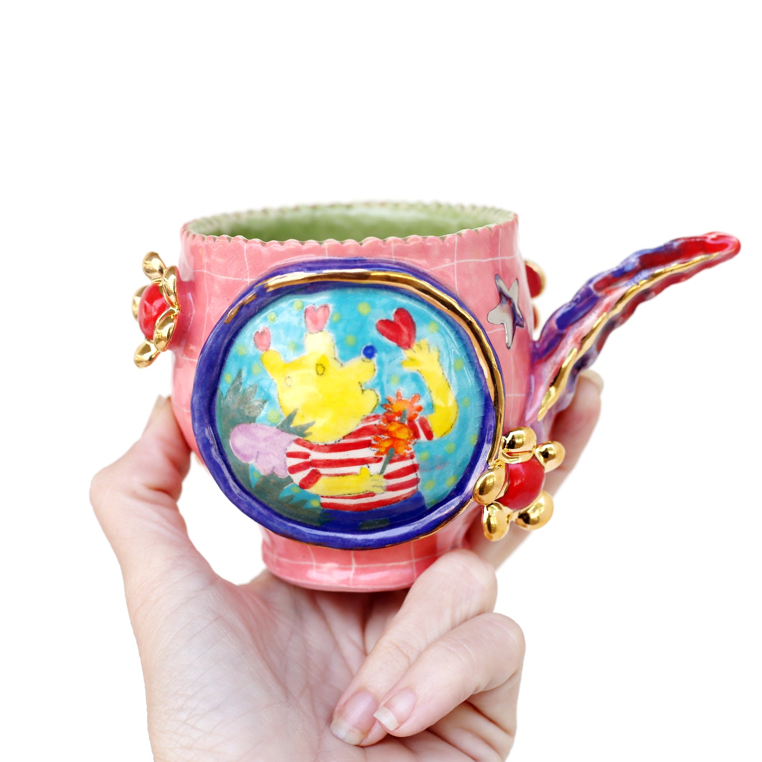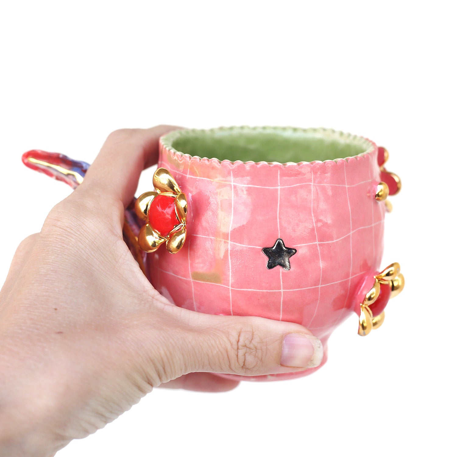 pink grid mug with circle “window” of character detail with gold luster glaze detailing and ombre blue to pink tail style handle