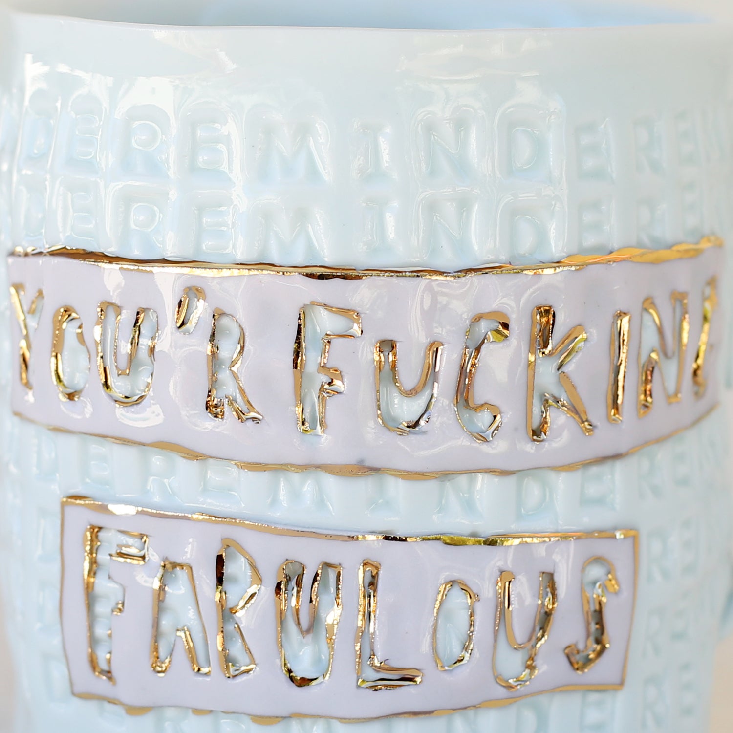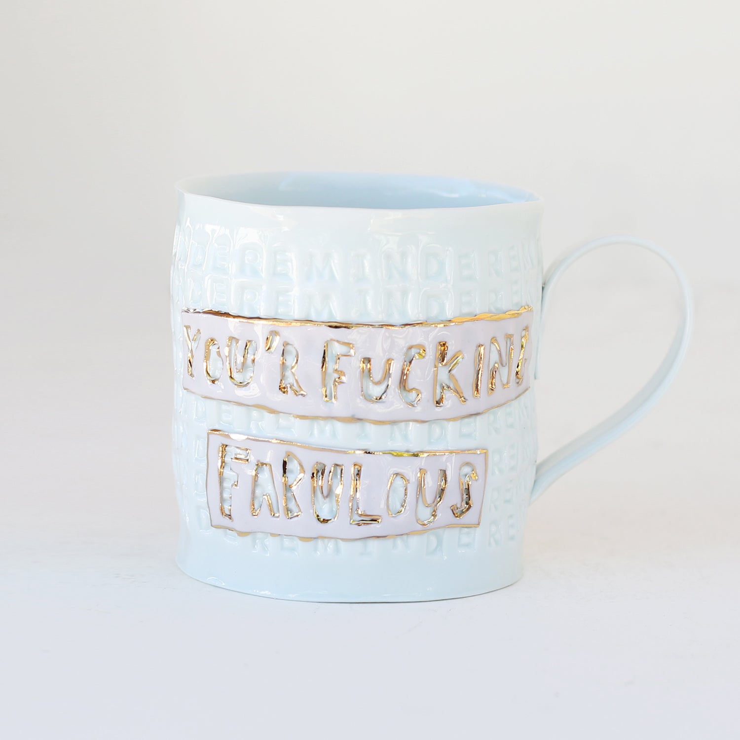 white porcelain mug thinly stamped with the words “Reminder: You'R Fucking Fabulous” ribboned around the mug, accented with gold luster