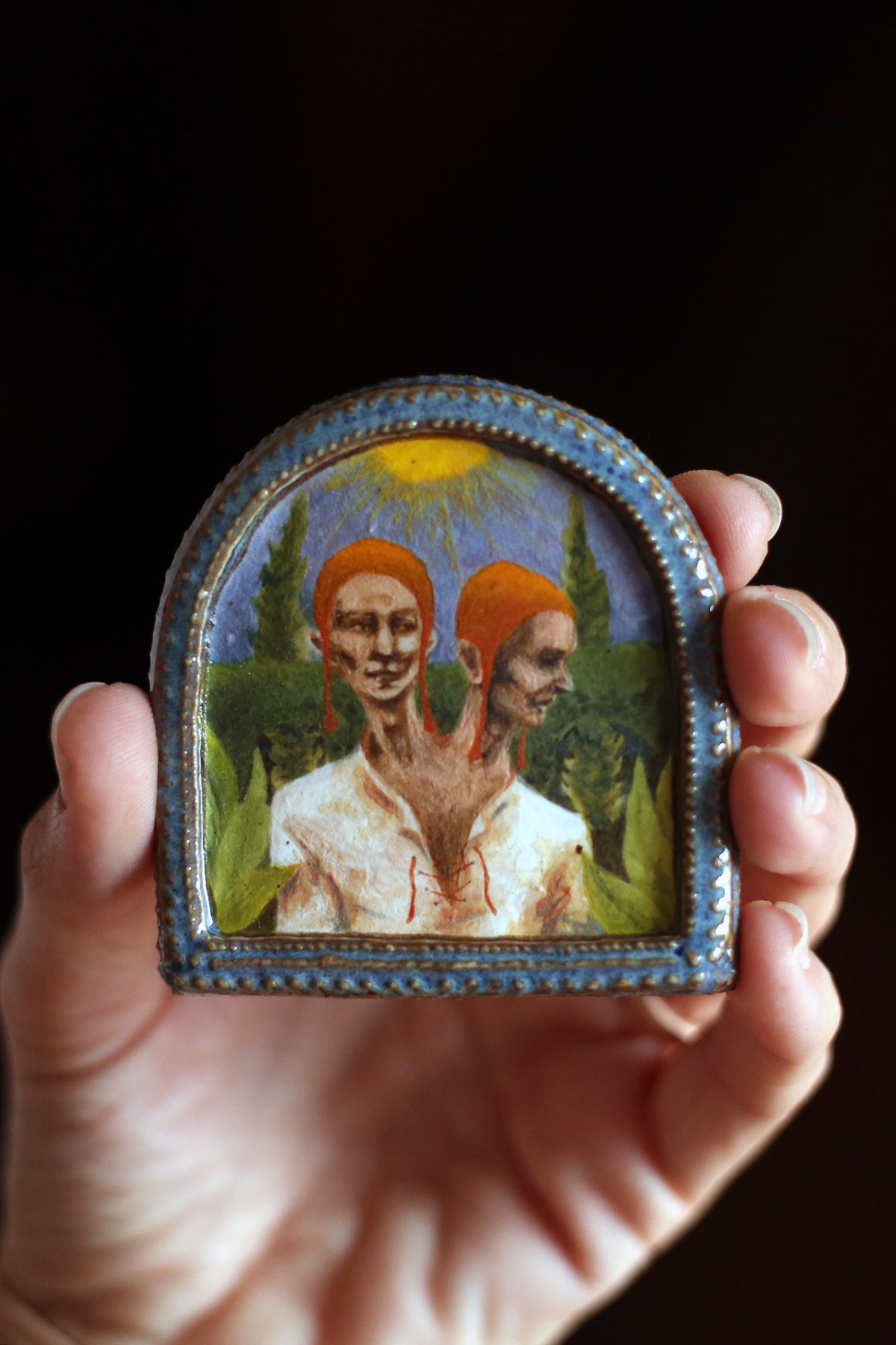 porcelain wall-hanging ceramic miniature painting of a portrait of a two headed person, detail painted with underglaze and glaze