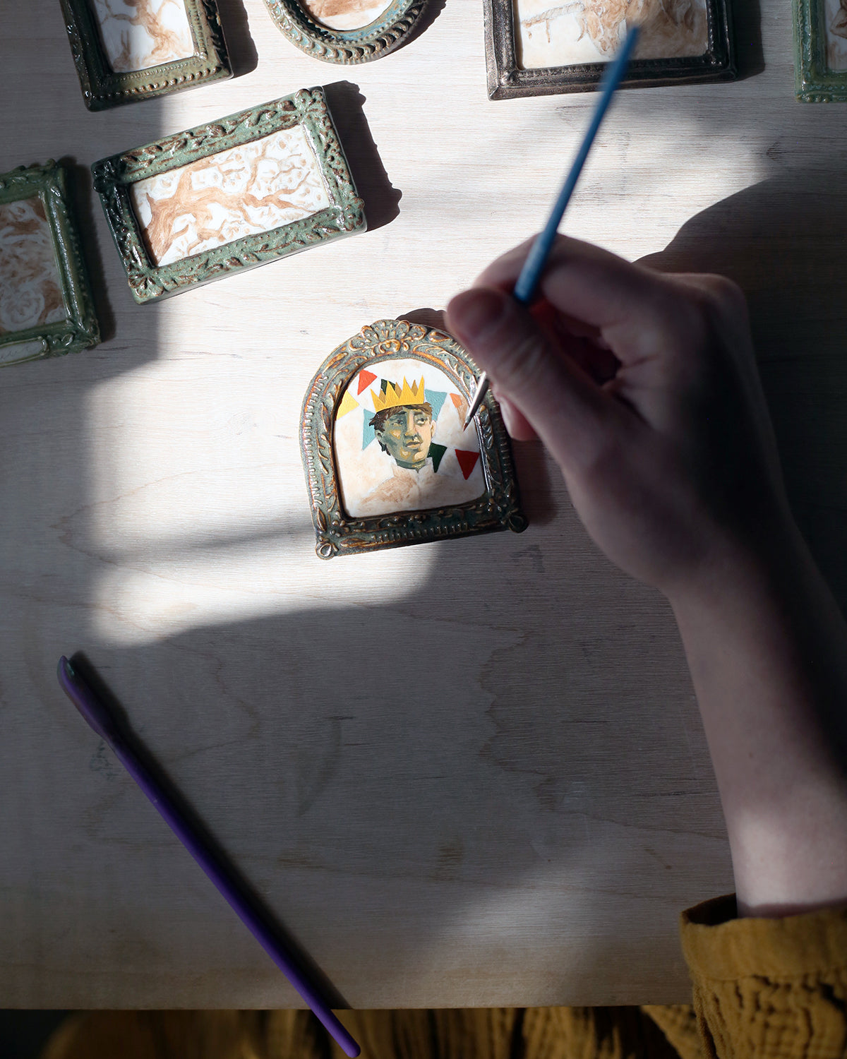 porcelain wall-hanging ceramic miniature painting of a boy in a paper crown, detail painted with underglaze and oils