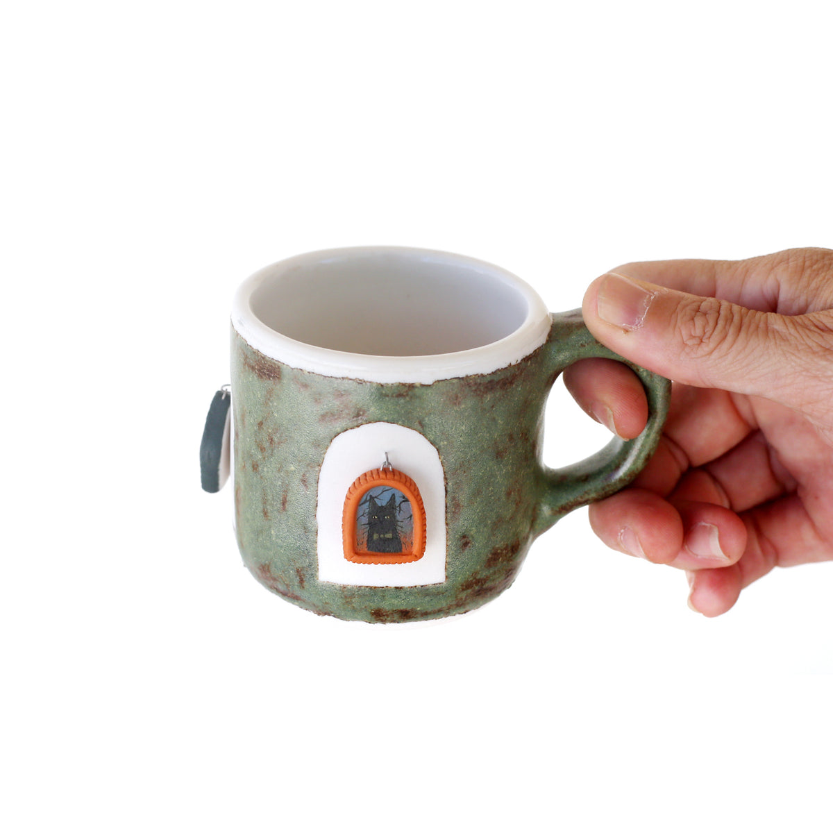 A simple little mug adorned with 3 dangling frames featuring tiny, but detailed paintings of animals set inside arches surrounded by one of my favorite glazes.