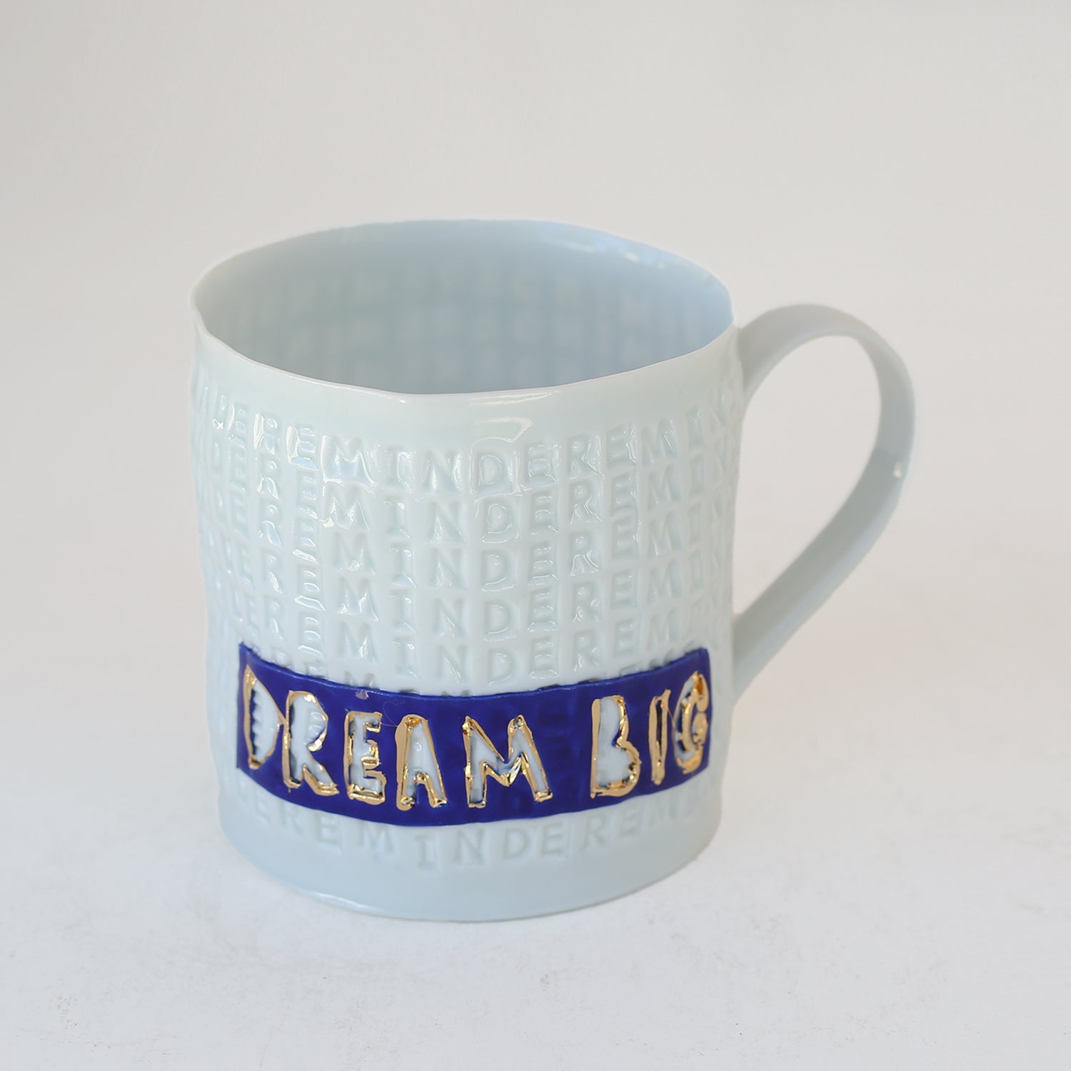 white porcelain mug thinly stamped with the words “Reminder: Dream Big” ribboned around the mug, accented with gold luster