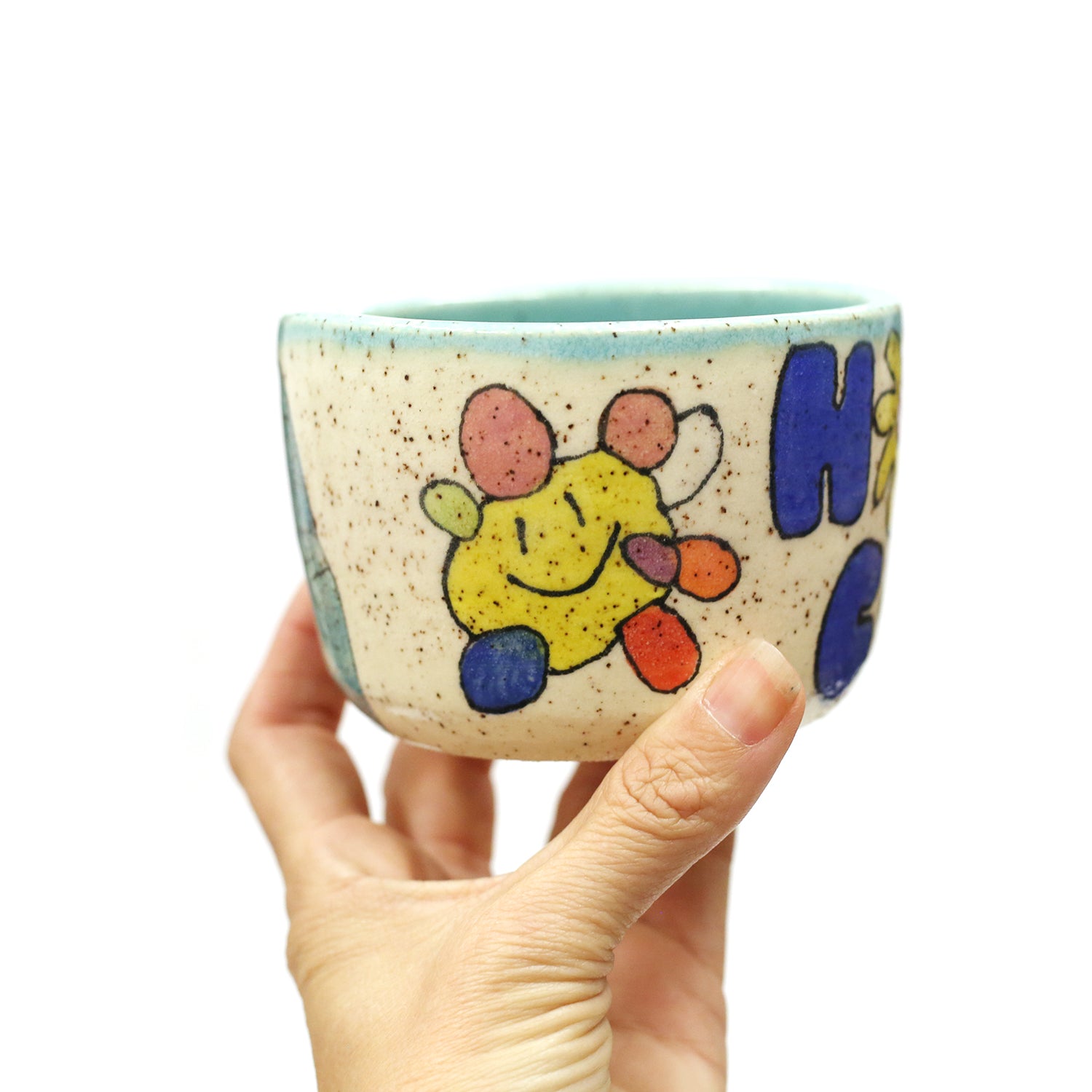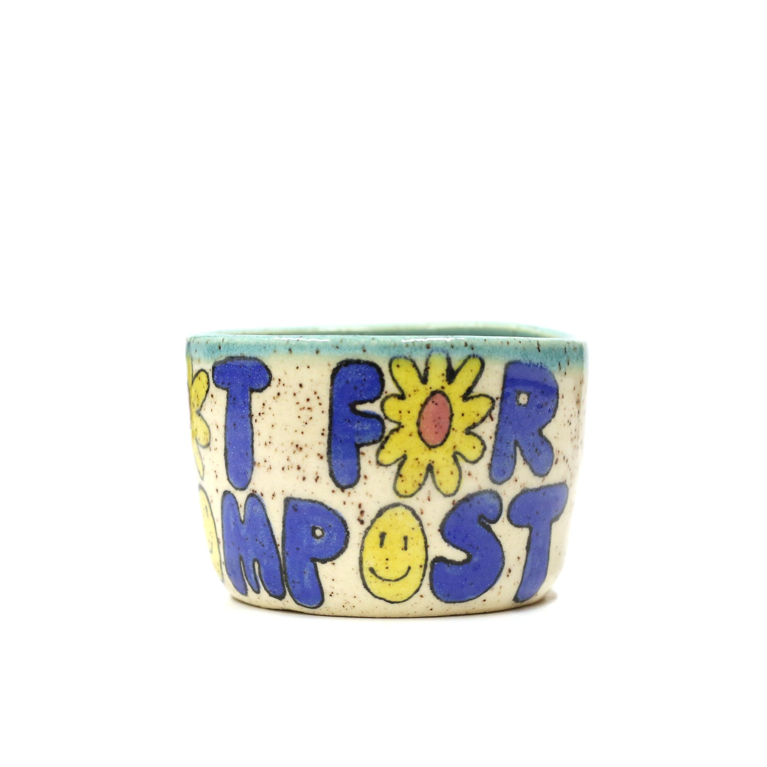 speckled ceramic cup with hand painted words "Hot For Compost" with yellow flowers, smiley faces, and a rock on blue hand
