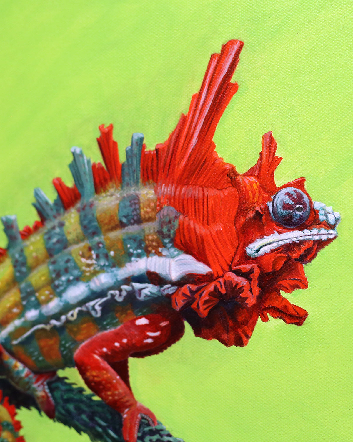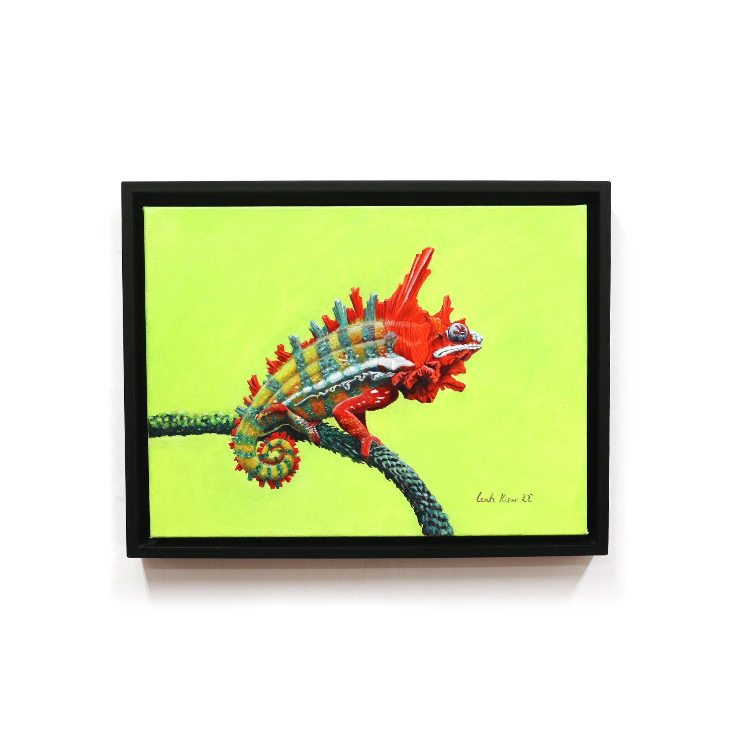 image description: a chameleon hanging out on a branch with a rad red mohawk and a lime green background