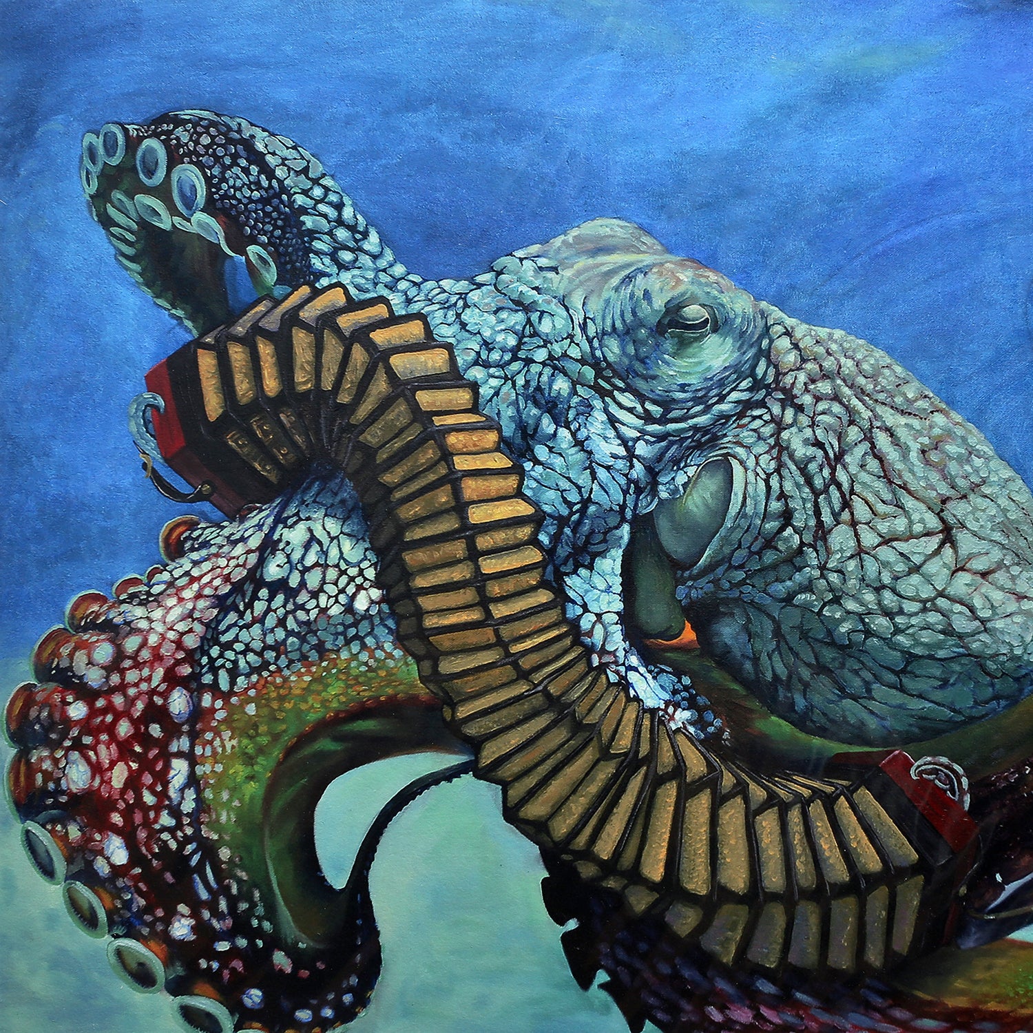 image description: a teal and maroon octopus playing a red and yellow accordion in the ocean blue