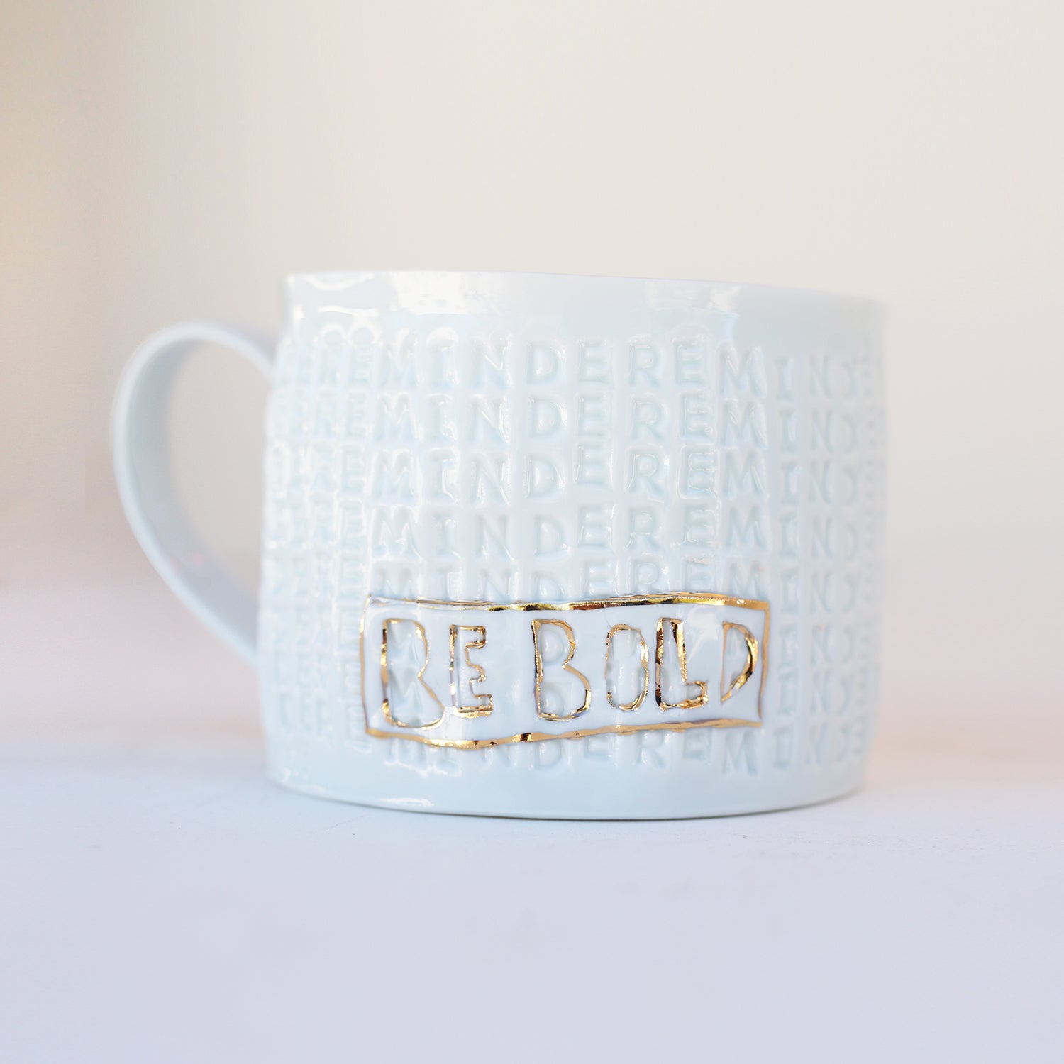 white porcelain mug thinly stamped with the words “Reminder: Take a Chance” ribboned around the mug, accented with gold luster